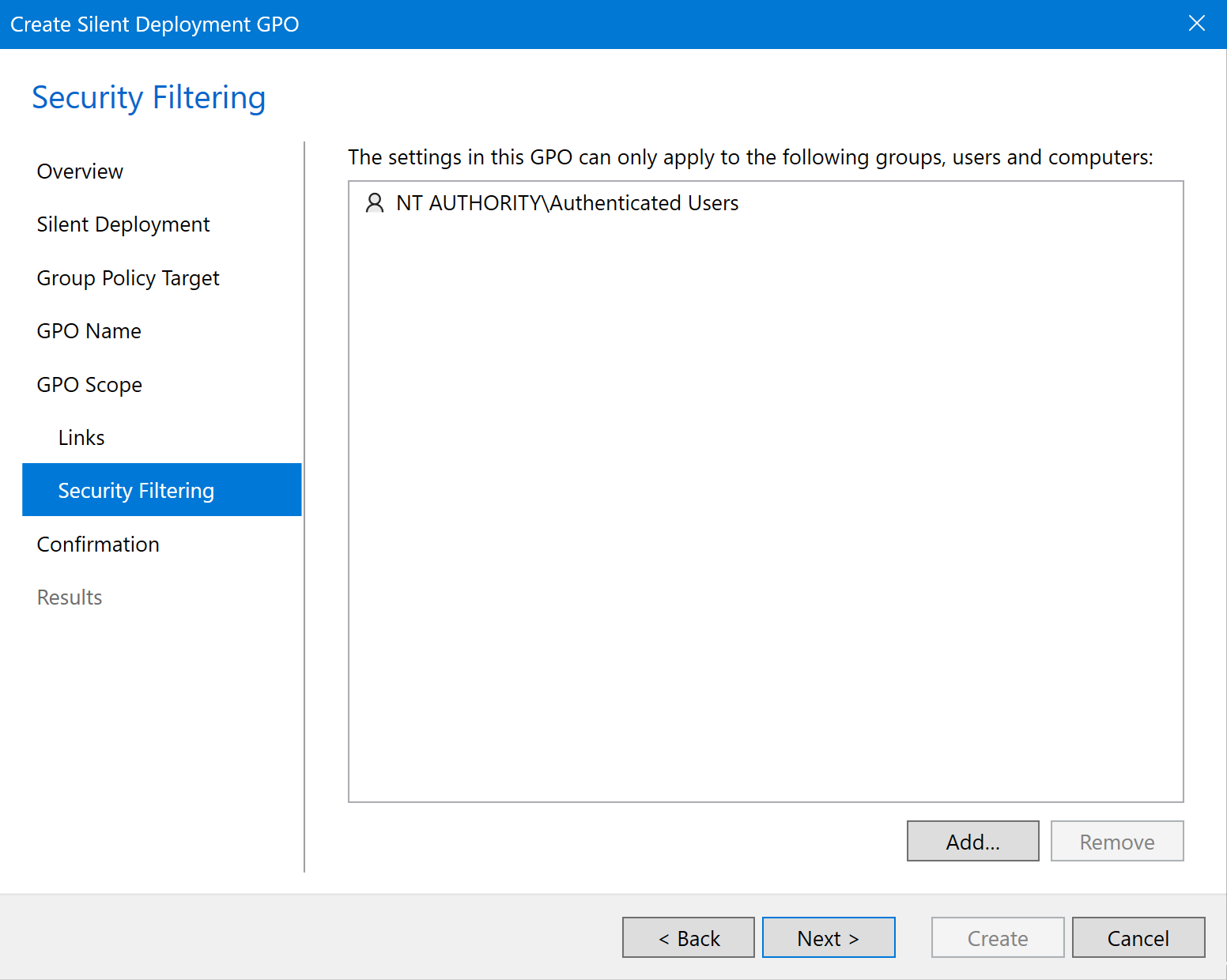 To apply this policy only to a small number of computers for a gradual roll-out, add one or more computer objects (or security groups of computers) to this list and Remove all other entries from the list. You will be able to expand this list later using the GPO Properties.