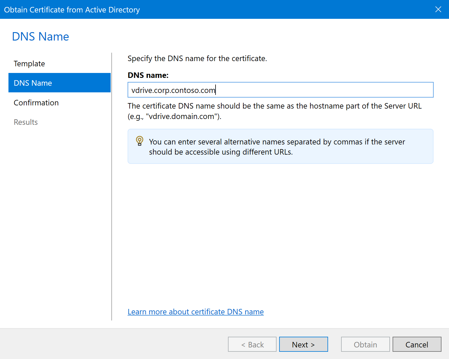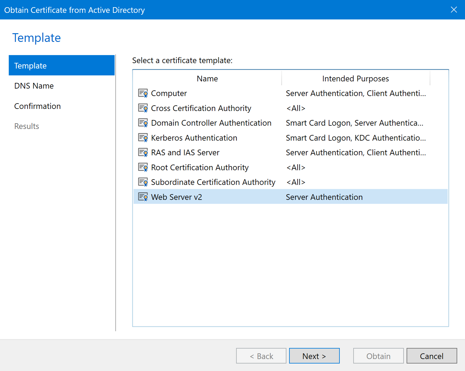 - On the Confirmation page, click Obtain to get the new certificate from AD CS. The certificate will be automatically installed in your local certificate store and selected on the HTTPS Certificate page of the Server URL wizard.