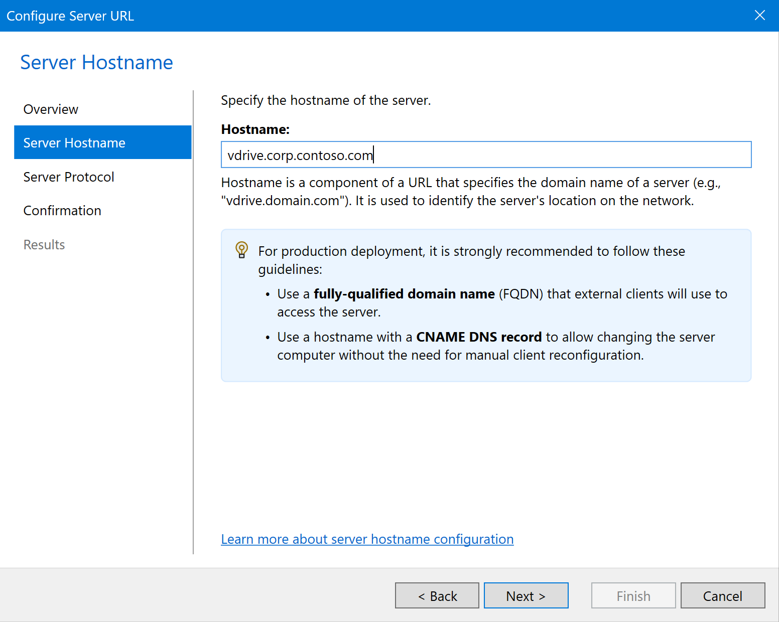 On the Server Hostname page, enter the fully qualified domain name at which users will access VisualDrive Server:
