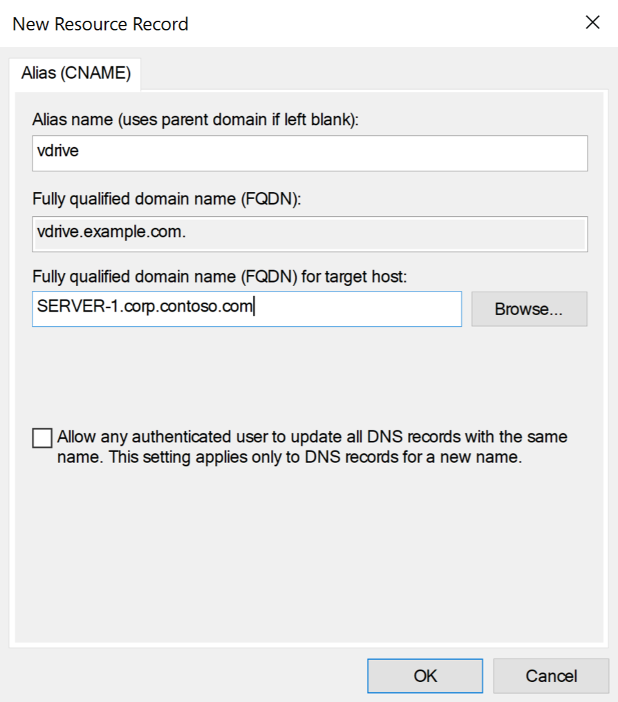 For example:vdrive.corp.contoso.comHow to create an appropriate DNS alias for the computer name